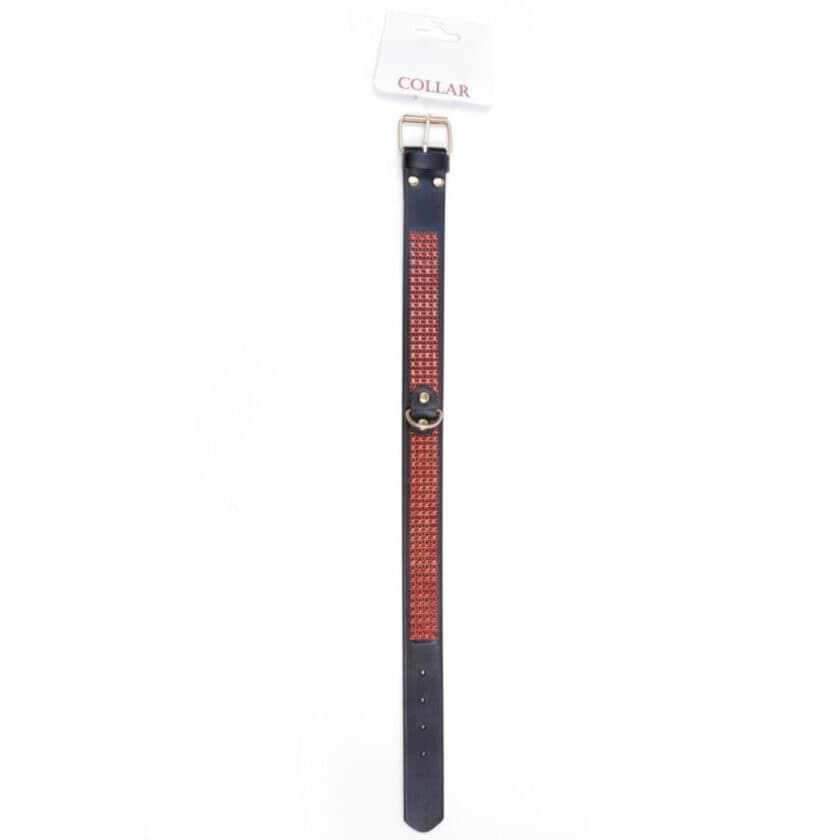 Ekskluzywna obroża z kryształkami w kolorze czerwonym z wytrzymałej skóry ekologicznej delikatnej w dotyku, dzięki czemu jest wygodna w noszeniu. Obroża jest regulowana w zakresie od 36 – do 42 cm.