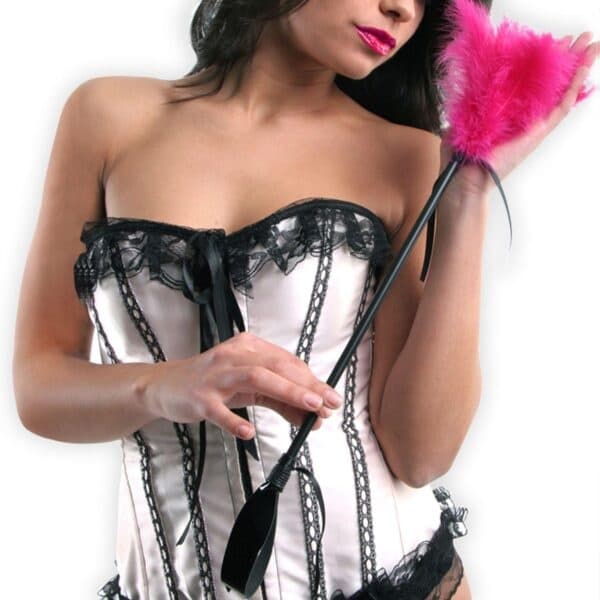Nadszedł właściwy czas, aby wypróbować tę nową zabawkę z szpicrutą po jednej stronie i łaskoczącym piórkiem po drugiej. Stymuluje lub pieści, gdy odpowiednik zasługuje lub wymaga sytuacji. Polubisz! Dwie satynowe kokardki dodają wyrafinowania temu nieśmiałemu, ale skutecznemu łaskoczkowi z piór Kolor fuksji Łaskotanie piór i uprawa jeździecka Wyprodukowane w Hiszpanii Wykonane z 20 piór Odporny pręt o średnicy 8 mm x 30 cm. Wymiary: 48 cm.