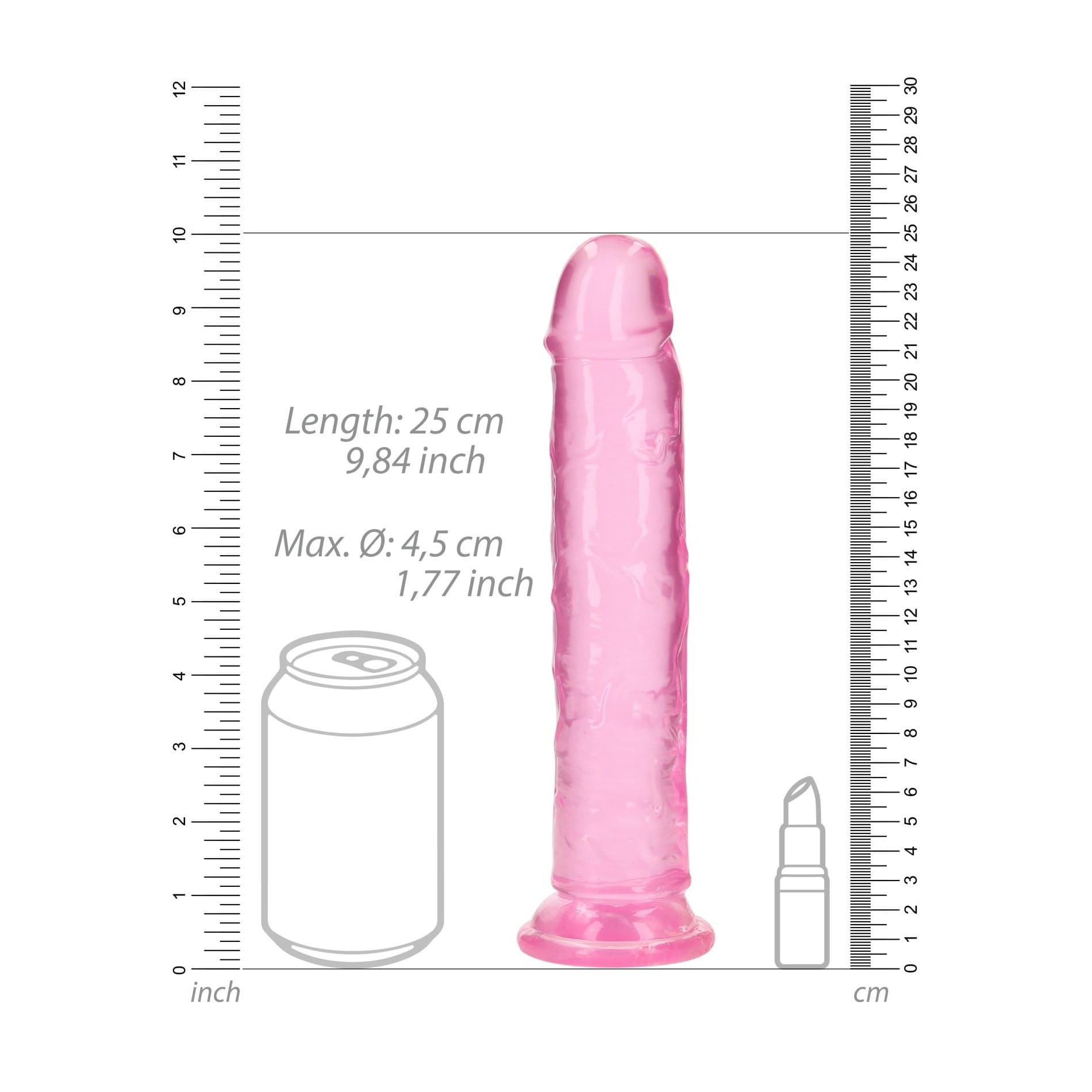 Model mierzy 9.8” (25 cm) wysokości wraz z przyssawką, głębokość penetracji wynosi 9.1” (23 cm) , a obwód 1.8” (4,5 cm).